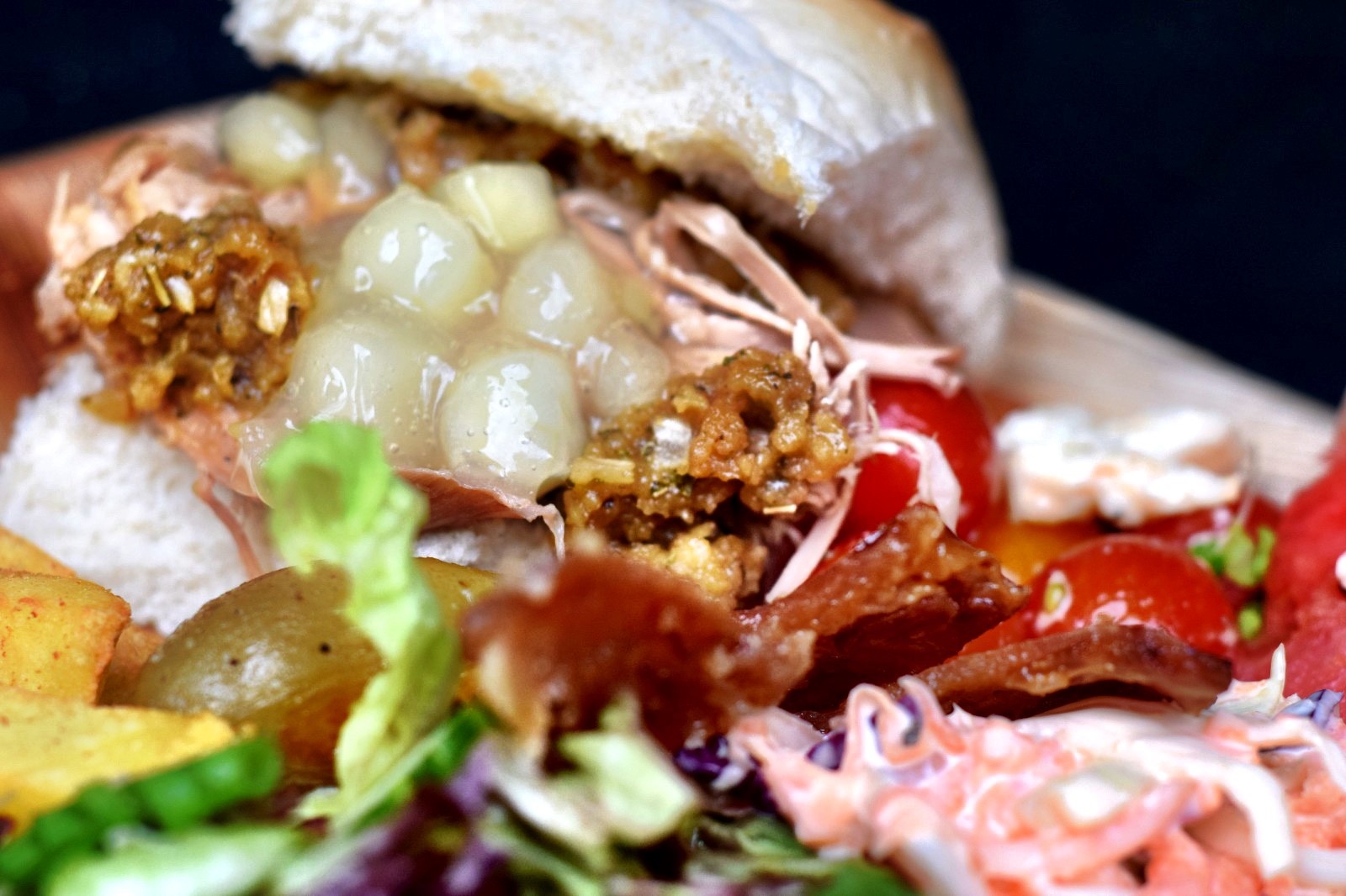 As the rain poured down, Hog Roast Kingsnorth followed the SatNav to the compact industrial estate where, under the protection of the catering gazebo, they began prepping the lunchtime menu. The Hogmaster Pro effortlessly transformed the whole pig into a succulent, golden masterpiece which when carved, revealed mouth-watering pulled pork encased in an irresistible layer of crispy crackling. With the main attraction complete, the team used freshly cut chunks of red onion, bell peppers and haloumi to create an abundance of veggie skewers which were served on flatbreads with tzatziki dip.